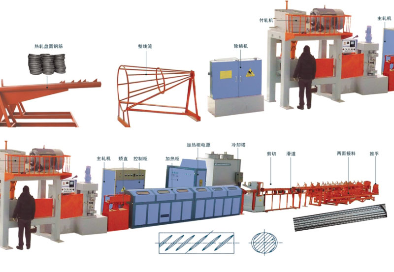 The complete set of equipment is composed of wire laying frame, whole wire cage, descaling machine, rolling mill, main mill, straightening, heating, temperature measuring, shearing, slideway, two side material receiving, pneumatic automatic pushing and take-up machine. The unit is designed according to the continuous working system, and the whole set of equipment is controlled by PLC system.