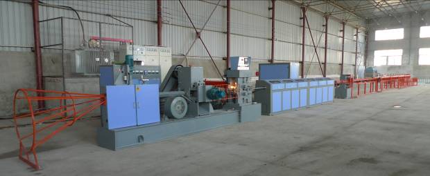 全套設備由放線架、整線籠、除鱗機、付軋機、主軋機、矯直、加熱、測溫、剪切、滑道、兩面接料、氣動自動推平、收線機等組成。機組按連續(xù)工作制設計,整套設備由PLC系統(tǒng)控制。