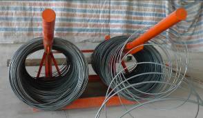 下面是各組成部分結(jié)構及性能的簡單描述: (1)放線架(見上總圖) 放線架的作用是保證該機組的高速運行,其由雙放線炮管組成,一個是工作架,另一個是備儲架,當一個在放線時可對另外一個炮管進行預裝料。當工作架上的盤圓放完時,將該卷盤圓的尾端與另備儲架上盤圓的頭端對焊打磨后,可繼續(xù)開機,此時可對另一個放線架進行預裝料,這種預裝料設計理念可提高因停機后裝料而降低工作效率。